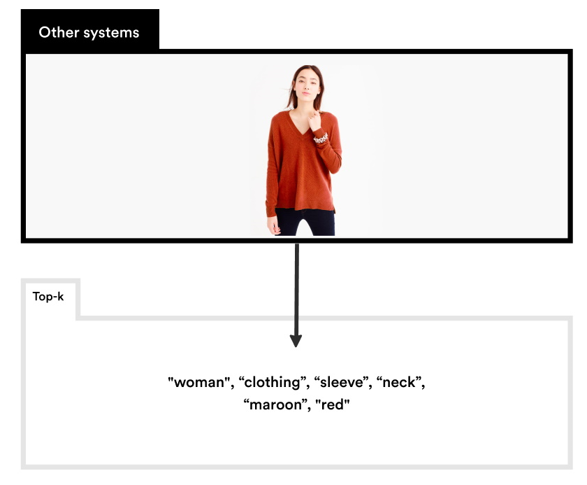 As you can imagine, that’s actually pretty useful. But it also leaves a lot to be desired. The system doesn’t really understand what “maroon” and “sleeve” really mean, except that they’re present in this image. If you asked the system what color the shirt is, it would be stumped unless you manually sorted through the list and said, these two things are colors, these are styles, these are variations of styles, and so on.
