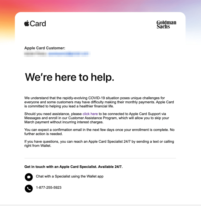 To join the Customer Assistance Program, Apple Card customers can either click the link in the email (here) or message or call an Apple support rep directly through the Apple Wallet app.