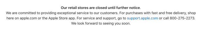 Earlier this week, in a press release, the iPhone maker said it would be closing retail stores outside China until March 27. A note on its website now says the shutdown is open-ended. Apple writes that the bricks-and-mortar stores “are closed until further notice” — so at the very least it’s signalling to customers to expect ongoing disruption to its retail business as usual.