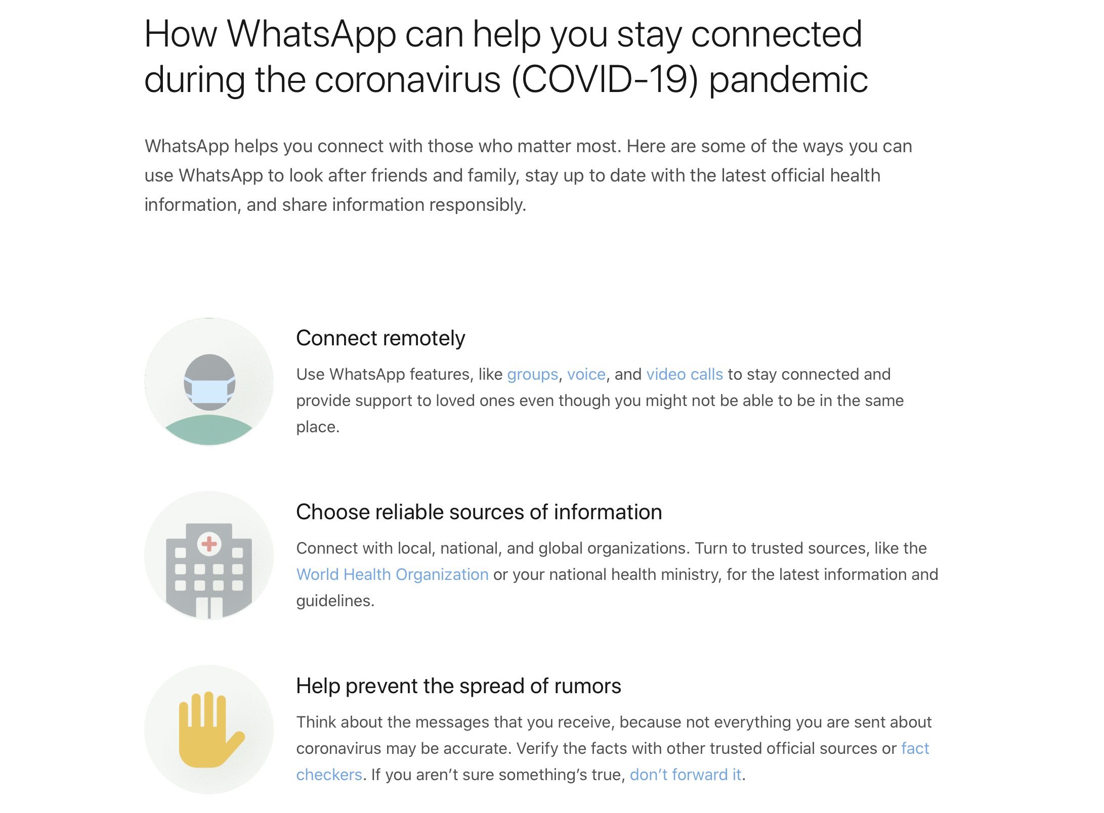 The Facebook-owned instant messaging service announced the WhatsApp Coronavirus Information Hub — in partnership with the WHO, UNICEF, and UNDP — to offer simple, actionable guidance, general tips and resources for users around the world to be better informed about the disease and hence reduce the spread of rumors.