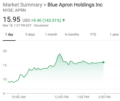 Until now. Suddenly Blue Apron is the hottest stock in the world, skyrocketing as other companies shed value. Today in regular trading, American indices fell so far that they triggered protective circuit breakers. At the same time, Blue Apron was doing this (via Google Finance):