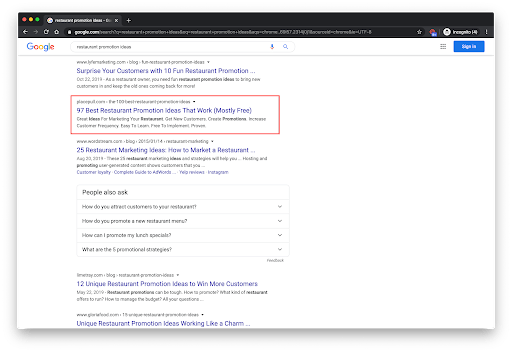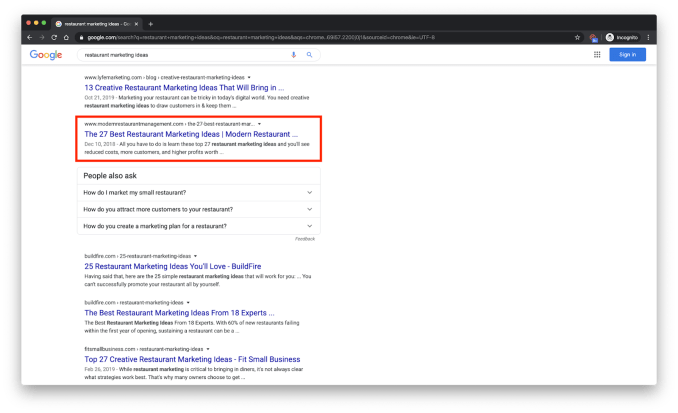 SEO optimization came down to having a few occurrences of the primary keyword (“restaurant marketing ideas”) and addressing the intent of a person searching for that keyword. In that case, that meant sharing ideas that they could apply to immediately increase sales in their restaurant. Plus, I included a meta title and meta description for the editor to use that I knew would drive clicks.