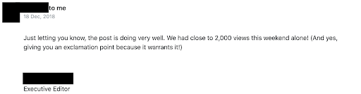 I even got an email from the editor congratulating me on our success and then another informing me that they had pinned the story to their homepage.