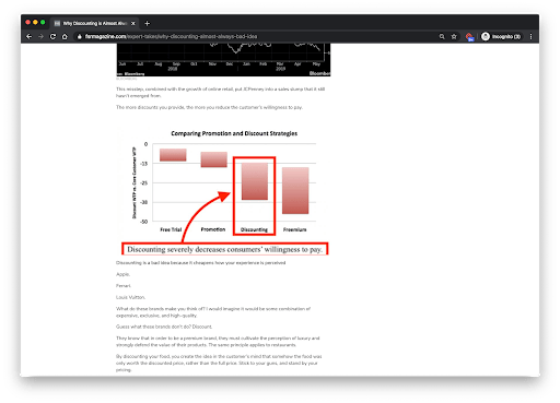 For example, I wrote one article with a contrarian insight that drove dozens of inbound leads. It was about discounting. Discounting is common practice in the restaurant industry. But it’s wildly unprofitable and damaging in the vast majority of cases.