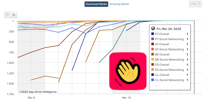 Houseparty topped all the charts on Monday, when Sensor Tower tells TechCrunch the app’s download rate was 323X higher than its average in February. As of yesterday it was #1 in Portugal (up 371X) and Spain (up 592X), as well as Peru, Argentina, Chile, Austria, Belgium, and the U.K. I despite being absent from the chart a week earlier. Apptopia tells me Houseparty saw 25 downloads in Spain on March 1st and 40,000 yesterday.