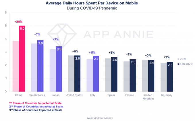 According to App Annie, daily time spent on mobile in China jumped to five hours per day on average in February, an increase of 30% compared to the average for 2019. Italy saw the second-highest increase at 11%.