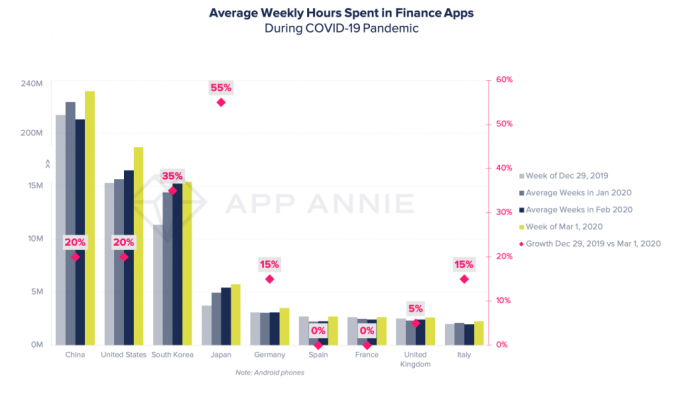 Japan, South Korea, the U.S., and China saw the biggest uptick in time spent during the first week of March, compared to the last week of 2019 at 55%, 35%, 20% and 20% respectively, the report found. Though Robinhood faced numerous outages as the stock market saw significant volatility, the app saw 50% growth across iOS and Android in the first half of March compared with two weeks prior. In Japan, au Pay grew 20% week-over-week in the first week of March. In South Korea, PASS by SK TELECOM grew 20% during that time.