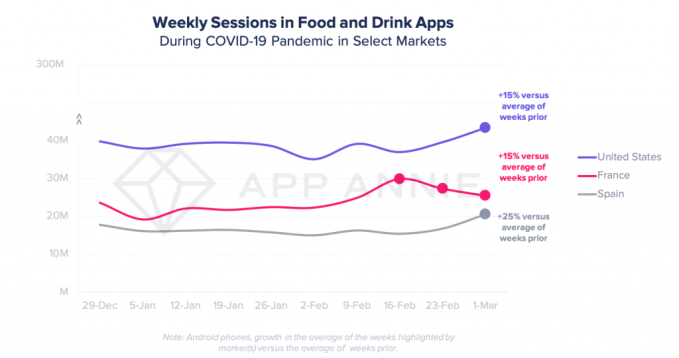 The strongest growth in total sessions in food delivery apps was in the U.S., Spain and France. France saw an uptick during the week of February 16, whereas Spain and the U.S. saw strong growth in total sessions during the week of March 1. China also saw strong growth in weekly time spent in February and the first week of March, but was still down from the beginning of 2020.