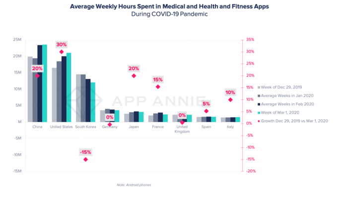 Other health and fitness apps saw notable increases as well, including the Mayo Clinic app in the U.S, which was up 200% week-over-week on Android, and Chinese exercise app Keep, up 210% in time spent in February.