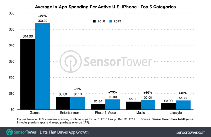 The latest from Sensor Tower indicates in-app purchases and premium downloads are on the rise. U.S. consumers on iPhone spent $100 on apps for the first time in 2019, up from $79 spent in 2018. These figures don’t include money spent on apps like Amazon, Uber and others, where purchases don’t flow through the App Store.