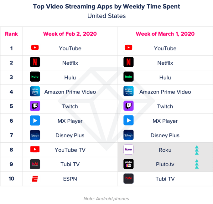 Time spent in the top 10 video-streaming apps (as measured on Android phones) has not yet seen a meaningful jump in the U.S. But the types of apps consumers are using may be impacted by the outbreak. As more people stay home, consumers are looking for free streaming options. That could have contributed to both Roku and Pluto.tv’s arrival into the list of the U.S. top 10 video-streaming apps. Roku’s app includes streaming content from its free movies and TV hub, The Roku Channel. Meanwhile, Pluto.tv lets users stream content without a subscription.