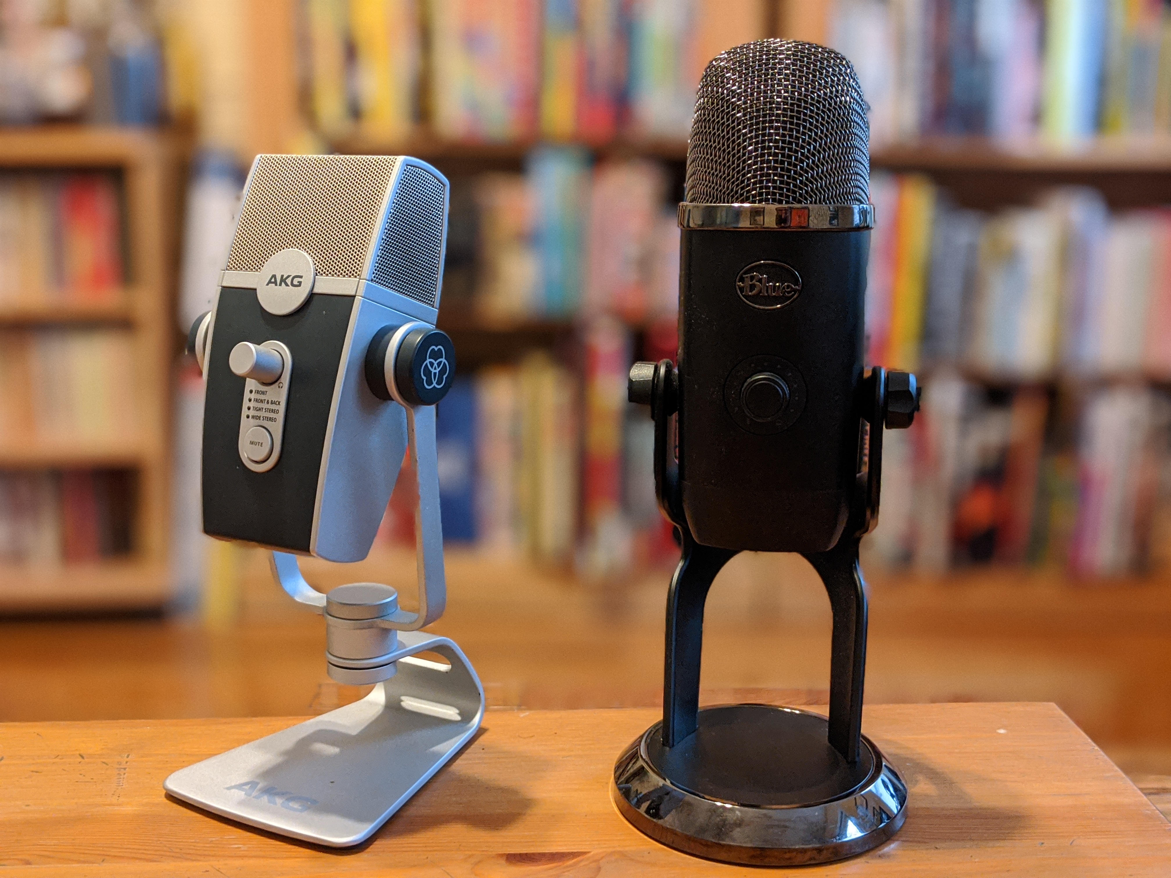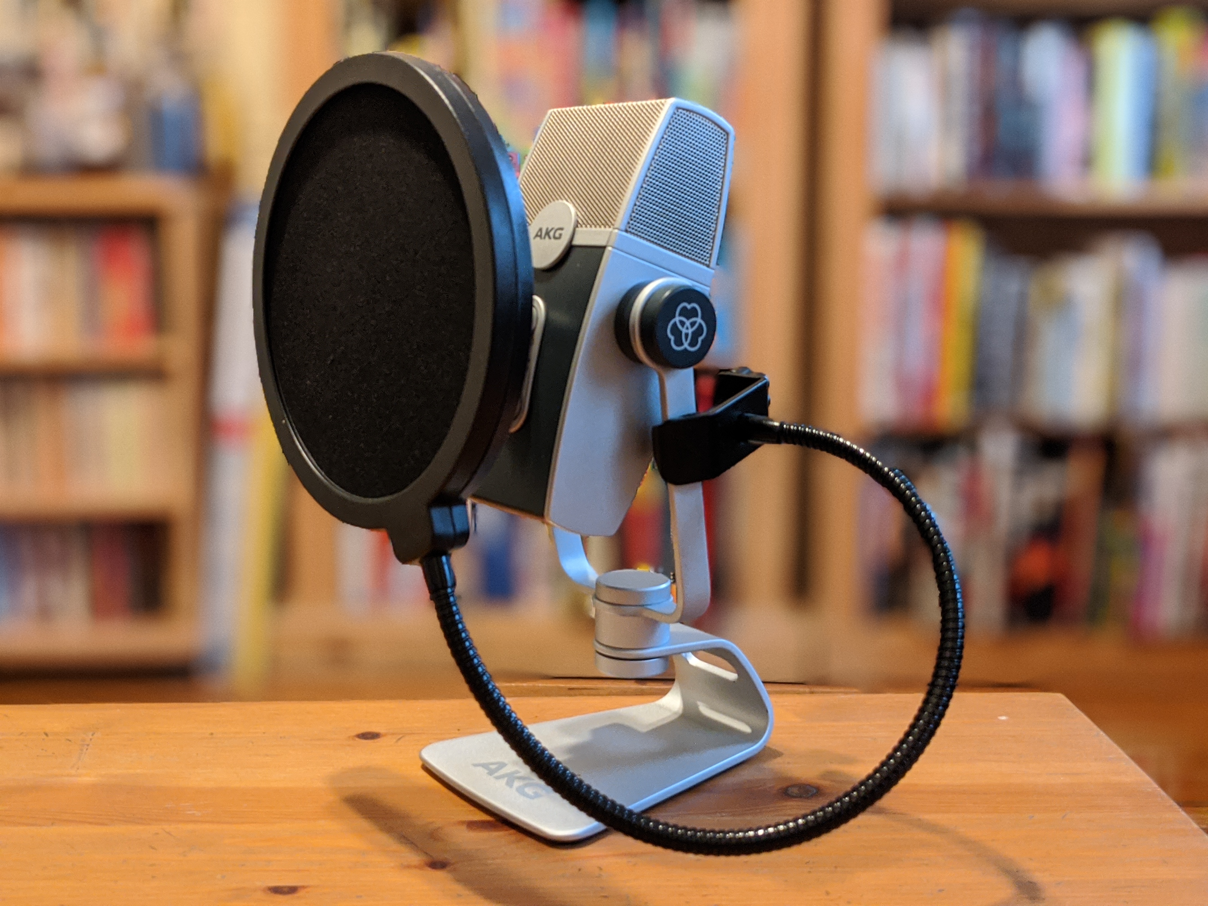 Currently I’m using the AKG Lyra. I’m pretty satisfied with the sound quality here. It’s priced about the same as the Blue Yeti and $100 cheaper than the Yeti Pro. The design is pretty eye-catching, though for my set up, it’s entirely out of frame. The controls on the mic are simple, a definite plus for those looking to plug and play. Lights on the front clearly indicate which of the four patterns (front, front and back, tight stereo, wide stereo) you’re using. I’m sure tens of thousands of podcasts have suffered sound issues from people with decent USB mics who simply have the thing in the wrong mode.