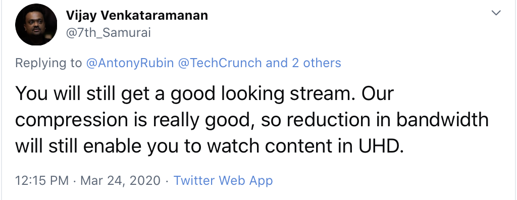 “Given the crisis, we’ve developed a way to reduce Netflix’s traffic on telecommunications networks by 25% while also maintaining the quality of our service. So consumers should continue to get the quality that comes with their plan – whether it’s Ultra-High, High or Standard Definition. We believe that this will provide significant relief to congested networks and will be deploying it in India for the next 30 days,” Ken Florance, VP Content Delivery of Netflix, said in a statement.