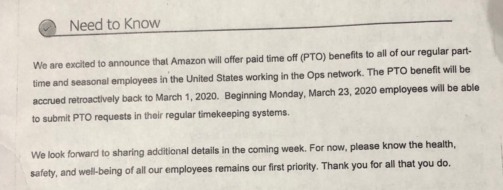 In the middle of these growing efforts, Amazon decided to grant PTO to all workers above 20 hours.