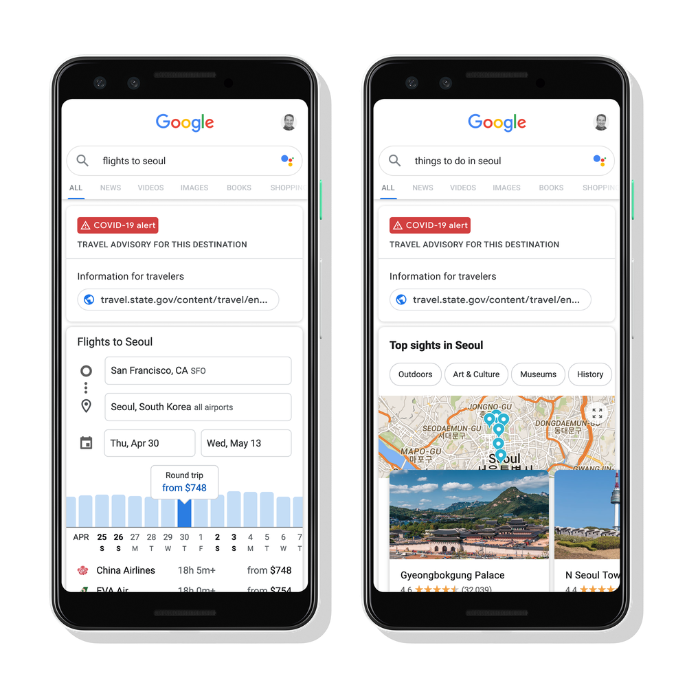 When you search for flights, hotels and activities, the site will now highlight active travel advisories for your destination. In addition, now that most airlines have changed their flight change and cancellation policies in light of the current COVID-19 pandemic, Google has added to the flight results page a direct link to your airline’s policies, too.