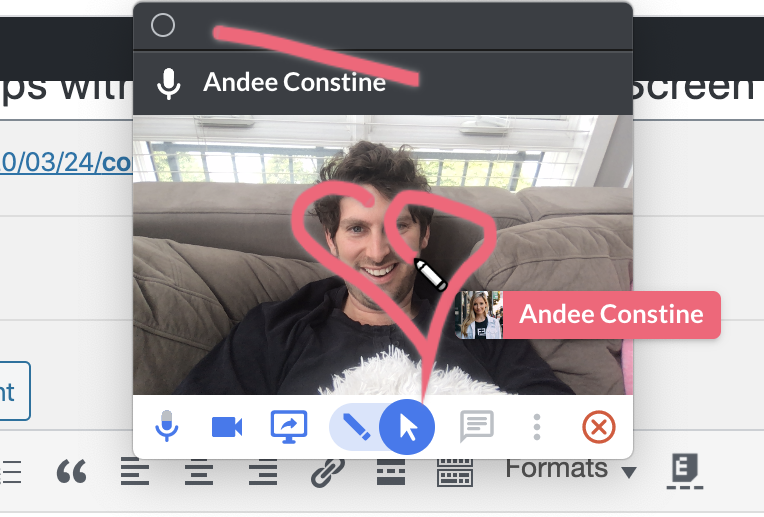 - Overlay drawing on the screenshare so you can annotate things like “this is misspelled” or “move this there,” with doodles fading away after a few seconds unless your hold down your mouse or turn on caps lock
