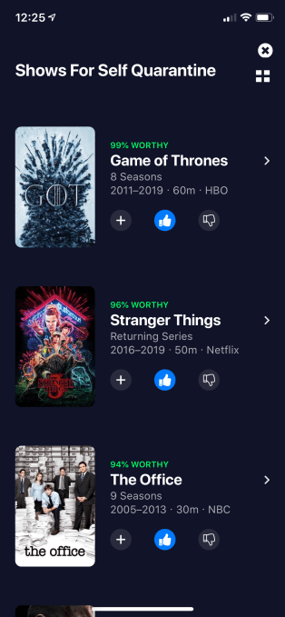 While there are already a number of apps promising to offer TV recommendations — like Reelgood, TV Time, Yidio and JustWatch, for example — Watchworthy’s advantage is Ranker’s data powering its recommendations. Its machine learning platform applies first-party correlation data it has amassed over a decade from one billion votes on Ranker.com. As the company explains, this makes its data more “statistically relevant.”
