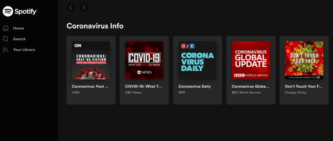 In addition, Spotify is adding a new feature to connect listeners with news and information about COVID-19. Through a new in-app hub, the company is pointing users to news and podcasts from the media, including ABC News, BBC World Service, CNN, Foreign Policy, and NPR.