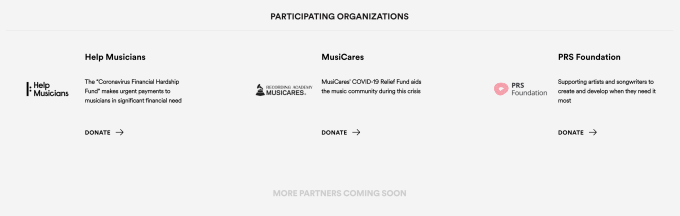 And though not yet launched, Spotify says it’s working to add a new fundraising feature for artists that will allow them to drive their fans to a fundraising destination of their own choice. This would allow artists to directly fundraise for other artists in need or another separate initiative of their own choosing. This feature will be optional for the artists to use and no changes to their profile pages will occur unless the artist wants to participate. And unlike the fundraising efforts on other sites, Spotify says it won’t take a cut of the funds.
