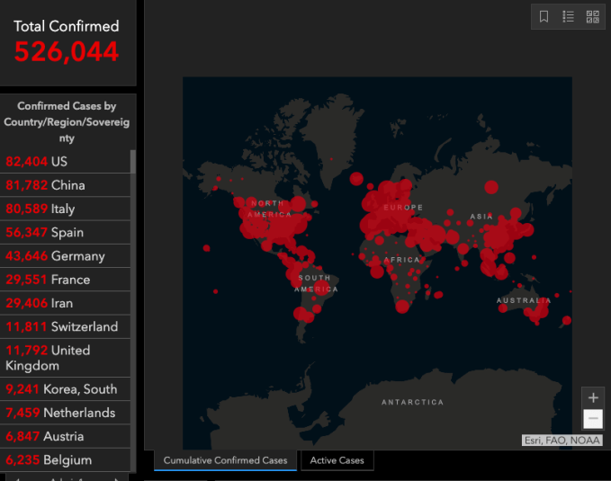 By Thursday afternoon around 3 p.m. PT, the U.S. reports 82,404 confirmed cases of the coronavirus to China’s 81,782 according to a popular COVID-19 tracking tool from Johns Hopkins. Italy, regarded as the world’s emerging hotspot in recent weeks, dropped to third with 80,589 cases.
