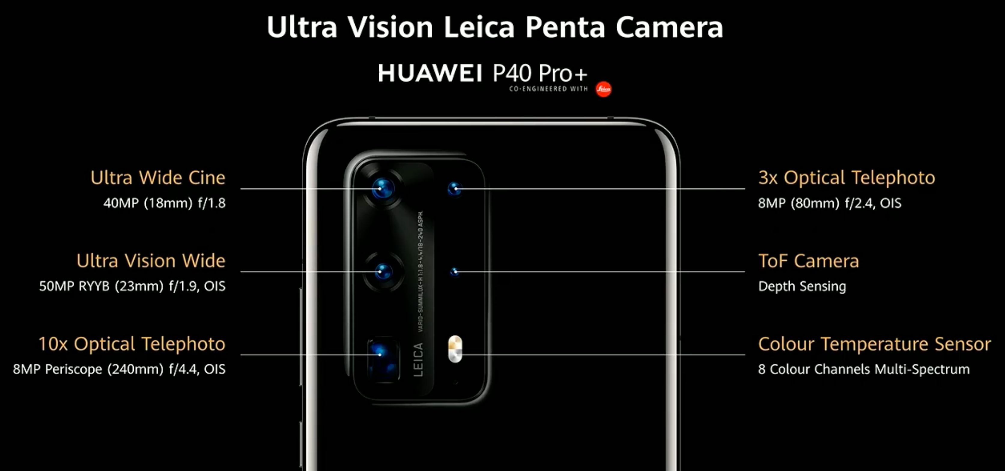 When it comes to cameras, the P40 Pro+ has four different camera modules and a time-of-flight sensor — an ultra-wide lens (18mm), a normal lens (23mm), a 3x lens (80mm) and a super periscope lens with a 10x optical zoom. That last camera is the equivalent of a 240mm lens.