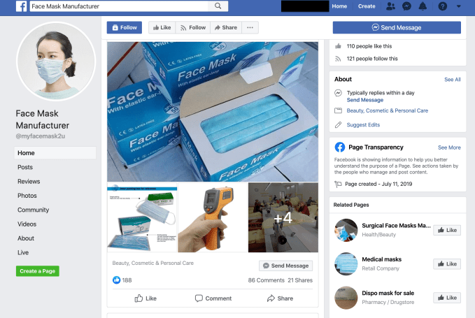 TechCrunch conducted our own searches on Facebook today and while some obvious search terms returned no results a little tweaking of keywords choice and we were quickly able to find additional pages hawking face masks — such as the below example grabbed from a Facebook page calling itself “Face Mask Manufacturer.”