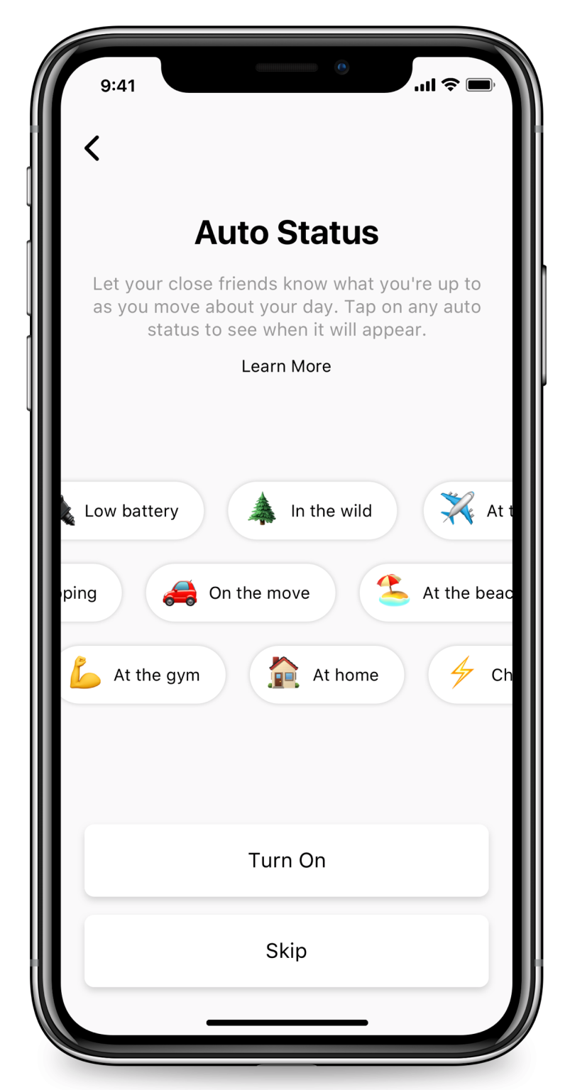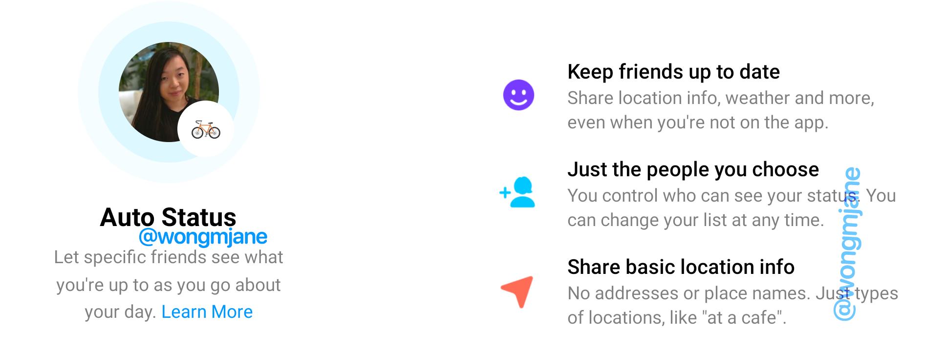 With Auto Status, you can “Let specific friends see what you’re up to as you go about your day. Share location info, weather, and more, even when you’re not in the app.” Auto Status is only visible to a special list of friends you can change at any time, similar to Instagram Close Friends. And the feature shares “no addresses or place names. Just types of locations, like “at a cafe.” Movement (driving, biking, walking), venue (at the movies, airport), cities (in Tokyo) and battery status (low battery, charging) are some of categories of what Auto Status shares.