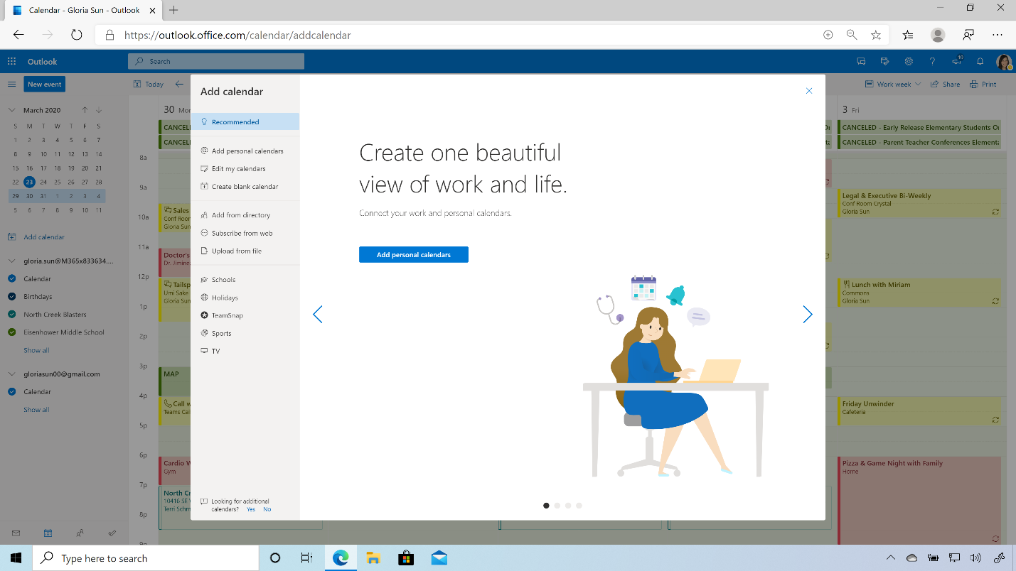 Even though you may want to forget about Outlook and ignore your inbox for a while, Microsoft doesn’t. In Outlook on the web, you can now link your personal and work calendars to ensure you don’t end up with a work meeting in the middle of a personal appointment, because Chris from marketing really needs another sync meeting during your gym time even though a short email would suffice.