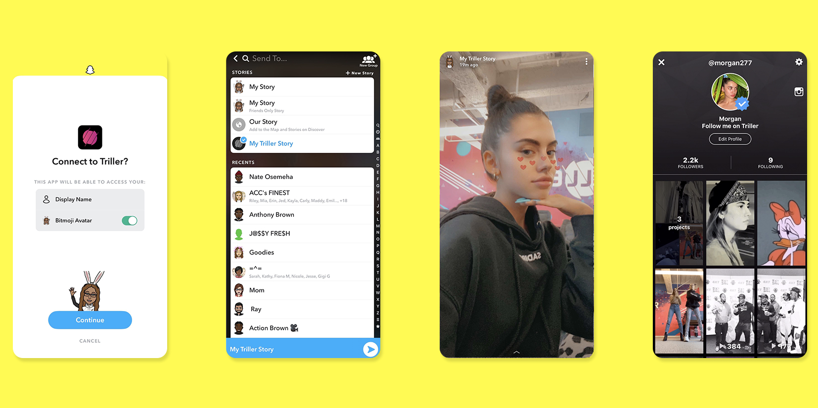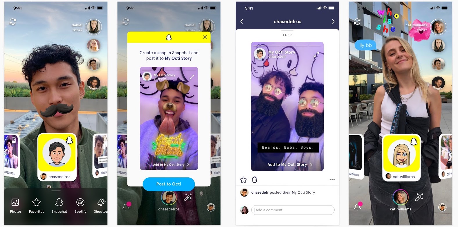 In Hily, Snapchat Stories partially replaces the homegrown version it’d spun up in the meantime to show potential dates off-the-cuff looks at people’s lives. In Triller, users can tap on a content creator’s profile pic to see biographical Stories instead of just their polished music videos. In Squad, users can co-watch Stories along with other things to screenshare. And in Octi, users can see someone’s Snapchat Story amongst other hidden content revealed by its augmented reality camera.