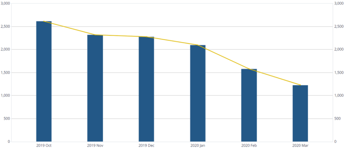 What’s stunning about this chart is that the timeframe Primack selected shows roughly 50% decline from October to March. This chart is from March 26th, mind, so the final month is short about a week, but it seems unlikely that the final few days of the month will close the gap to even February’s totals.