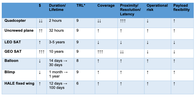 There are platforms, such as blimps, balloons and high-altitude long endurance (HALE) fixed-wing platforms that can duplicate functions now performed by drones or satellites in a more technically and commercially viable manner.