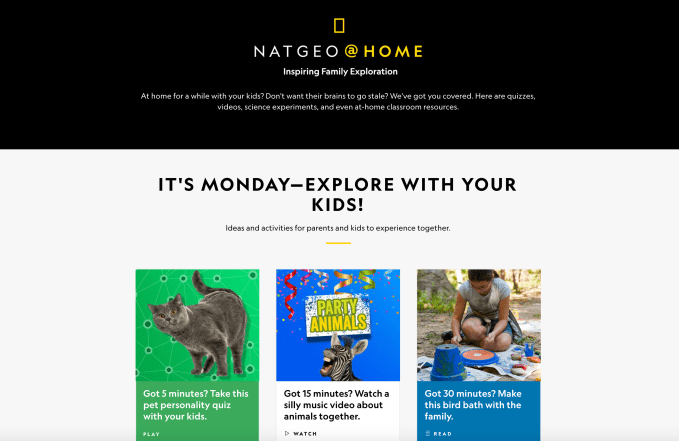 The COVID-19 outbreak has closed schools across most of the U.S., impacting more than 55 million students who are now learning at home. That’s created an increased demand for homeschool resources. Today, National Geographic is responding to that need with the launch of a new online hub, NatGeo@Home, which pulls together all of National Geographic’s family-friendly educational content into a one-stop shop for parents and teachers alike.