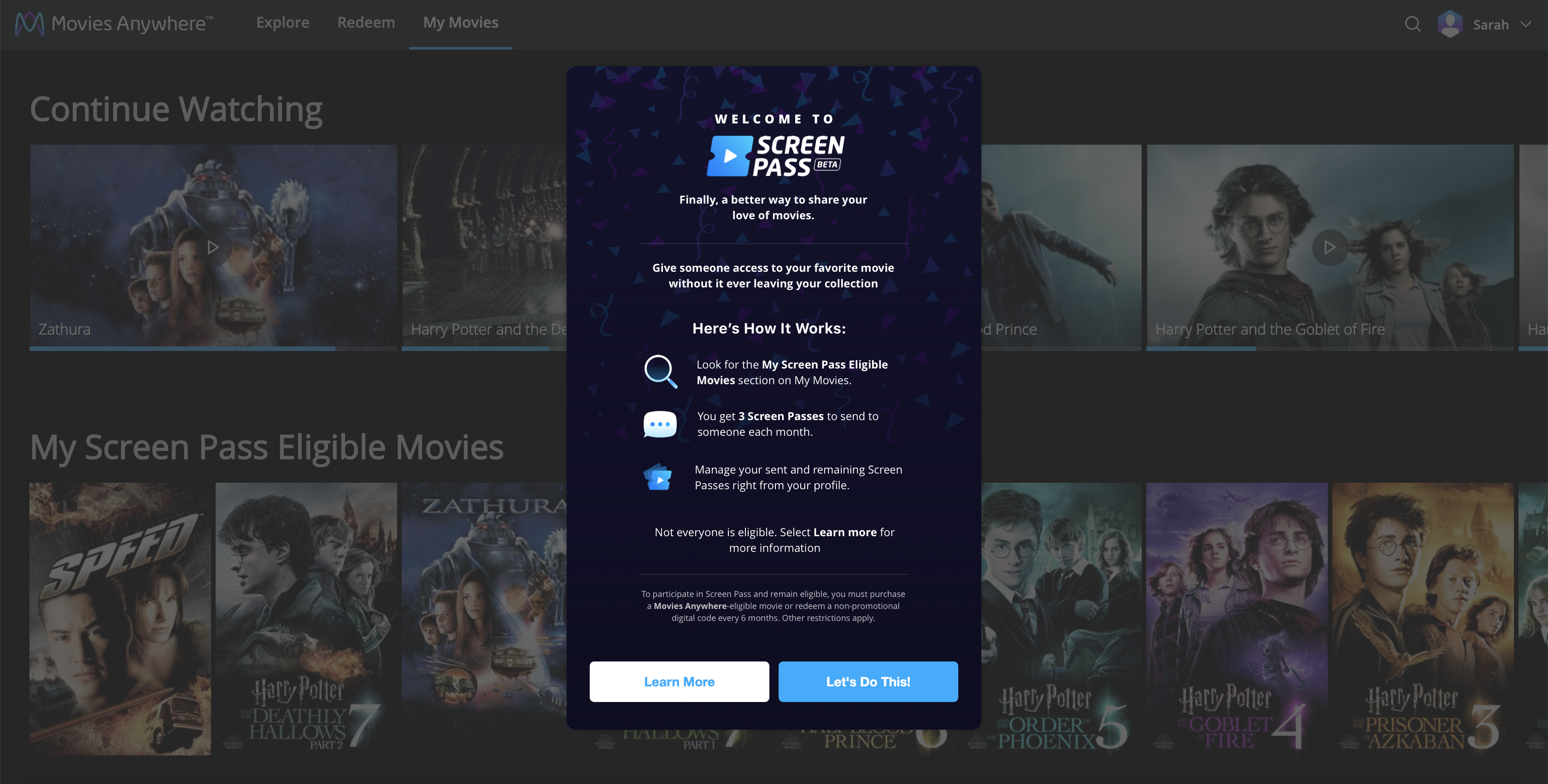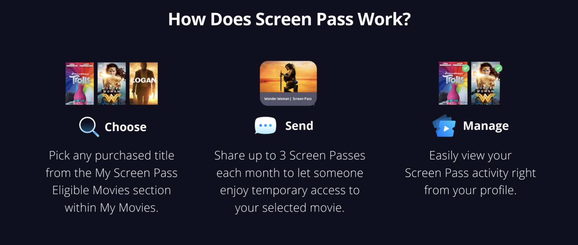 Screen Pass will allow Movies Anywhere users to loan out only three movies per month to family and friends. The movies can then be watched across the Movies Anywhere platform.