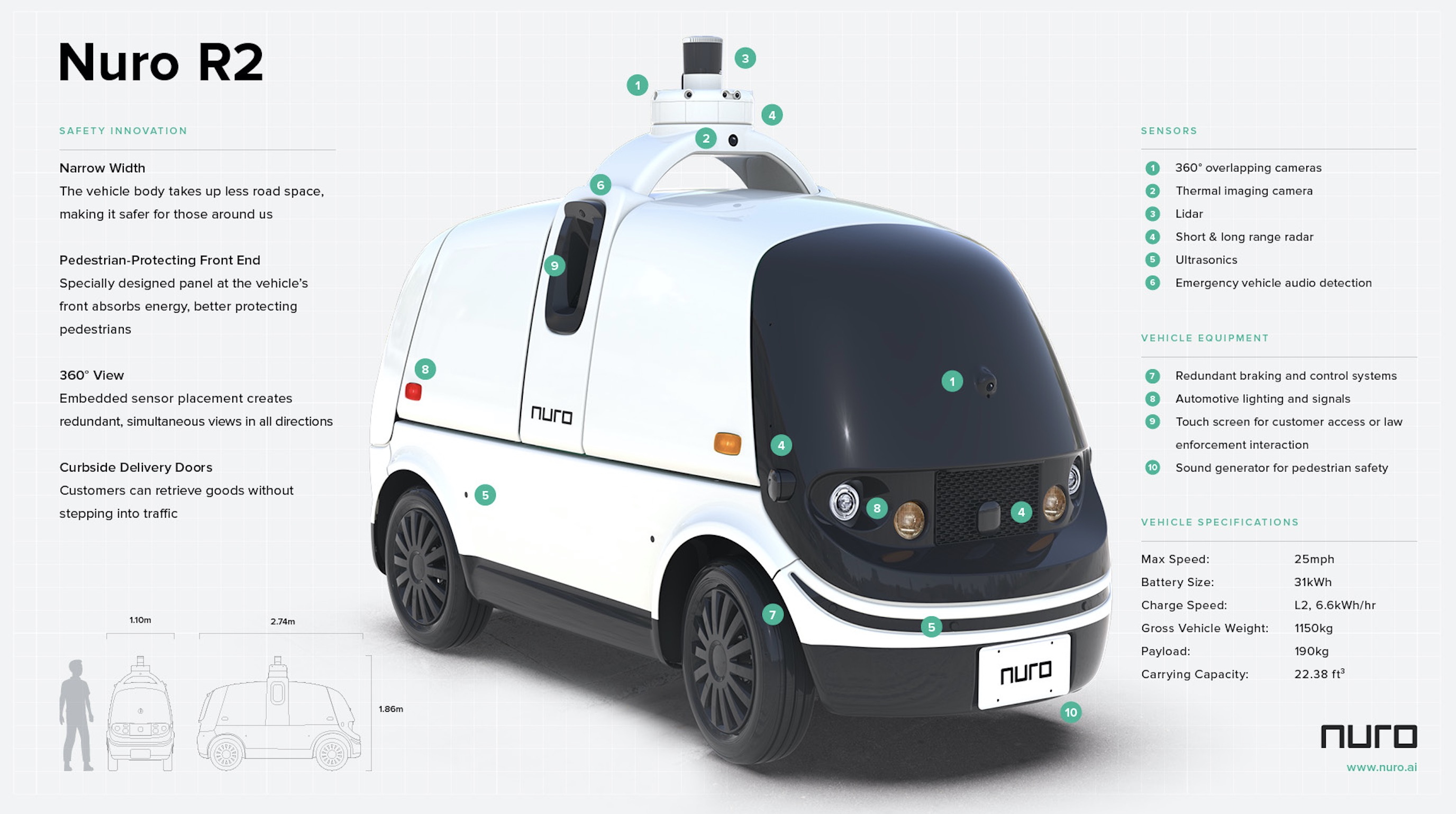 Its second-generation, vehicle called the R2, was introduced in February 2020. The R2, which was designed and assembled in the U.S. in partnership with Michigan-based Roush Enterprises, is equipped with lidar, radar and cameras to give the “driver” a 360-degree view of its surroundings. However, it is missing a few features typically required by the U.S. Department of Transportation’s National Highway Traffic Safety Administration.