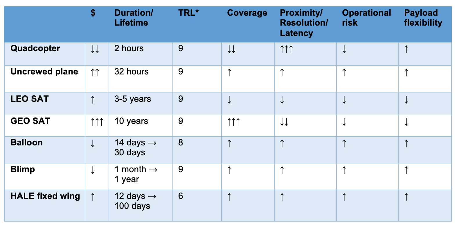 You can take a cell phone, throw it up onto a balloon, and loiter over a single point. It comes with its own challenges like the intense winds in the stratosphere… Loon has had a lot of issues doing it. Loon is able to loiter over the entire country of Peru. That’s… not very good! We need a double-digit kilometer radius number for it to be likable. Also, as you can imagine, the sensors are moving around a lot up there. So it’s even more difficult to get the resolution necessary.
