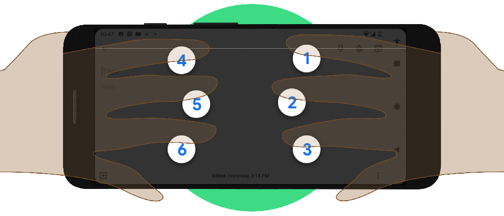 The user holds the phone in landscape mode, with the screen facing away from them, and taps the regions corresponding to each of the six dots that form letters in the braille alphabet. It works with Android’s TalkBack function, which reads off words the user types or selects, so like any other writing method errors can be quickly detected and corrected. There are also some built-in gestures for quickly deleting letters and words or sending the text to the recipient or selected field.
