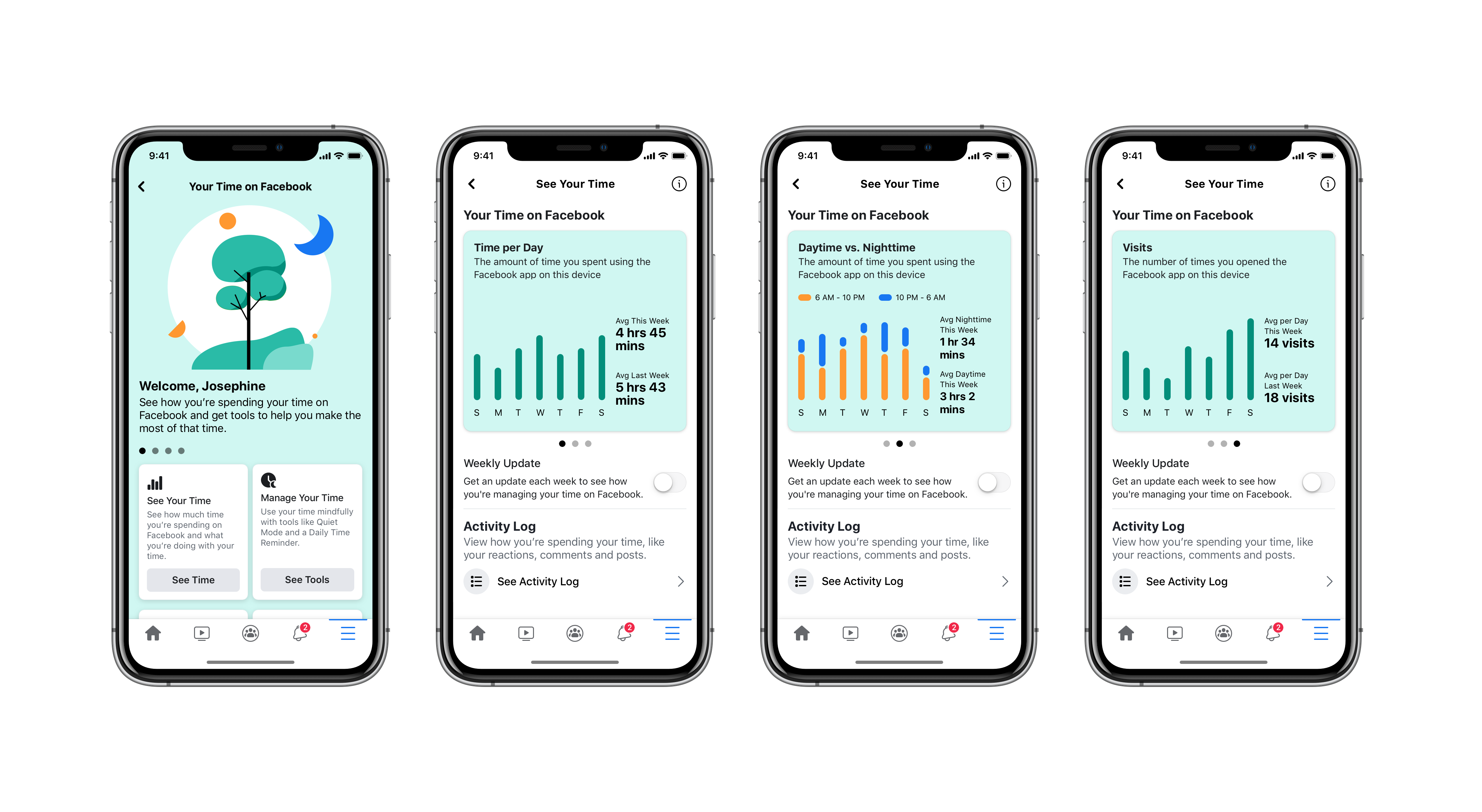 The controls for Quiet Mode will be found in a new section on Facebook where you can view other data about your time spent on Facebook’s platform. Here, you’ll be able to browse charts that show you the time you’ve spent on Facebook on a daily basis, a comparison of your daytime versus nighttime use, and another chart that lets you see how many times you opened the Facebook app each day.