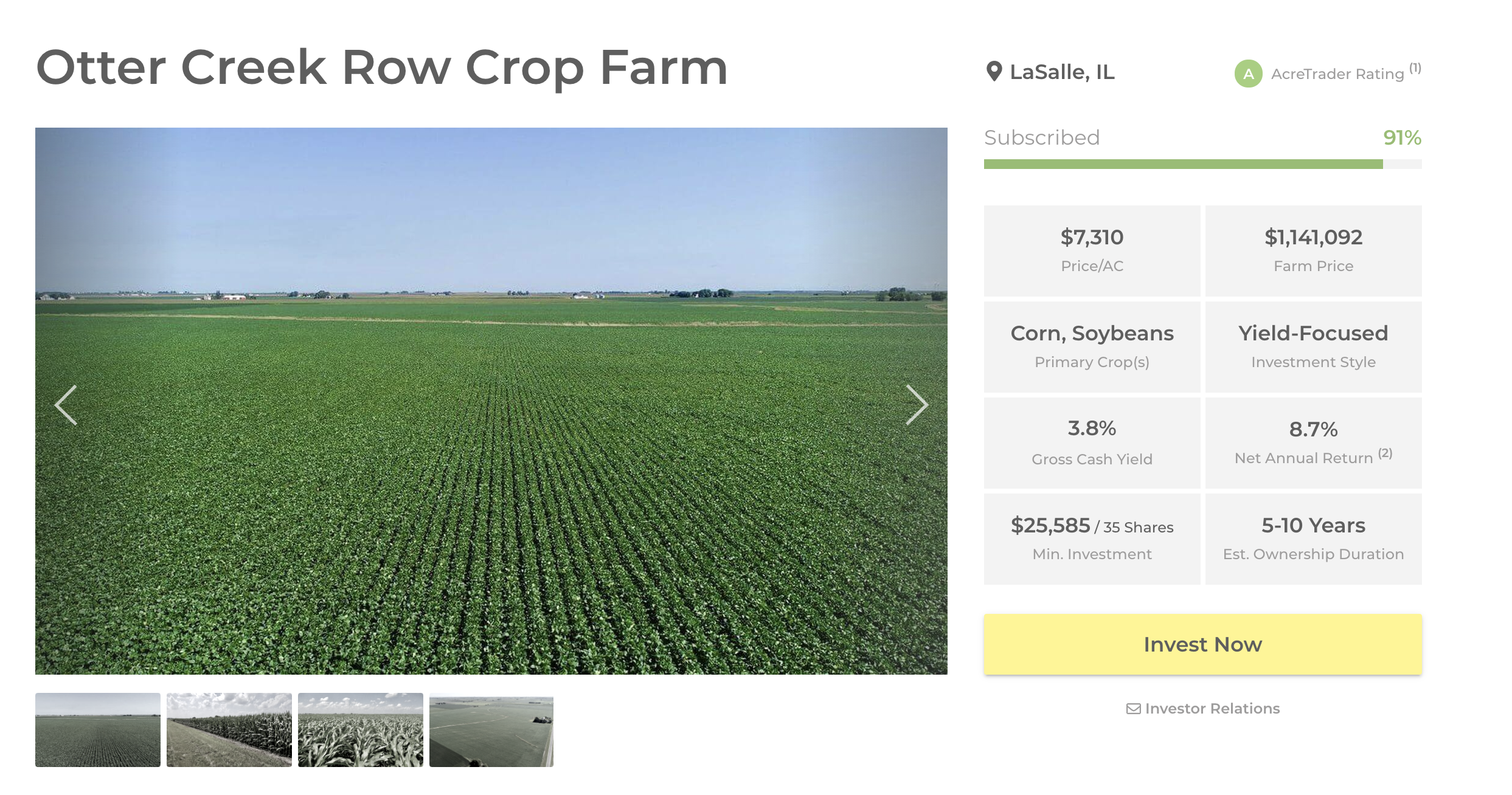 The AcreTrader platform connects buyers, like individual investors, family offices, or investment funds, to farmland that is available for purchase. AcreTrader incorporates each property it acquires under an LLC, and then users are able to buy shares of that entity. Think of shares in terms of acres, so 20 shares could be 2 acres of land.