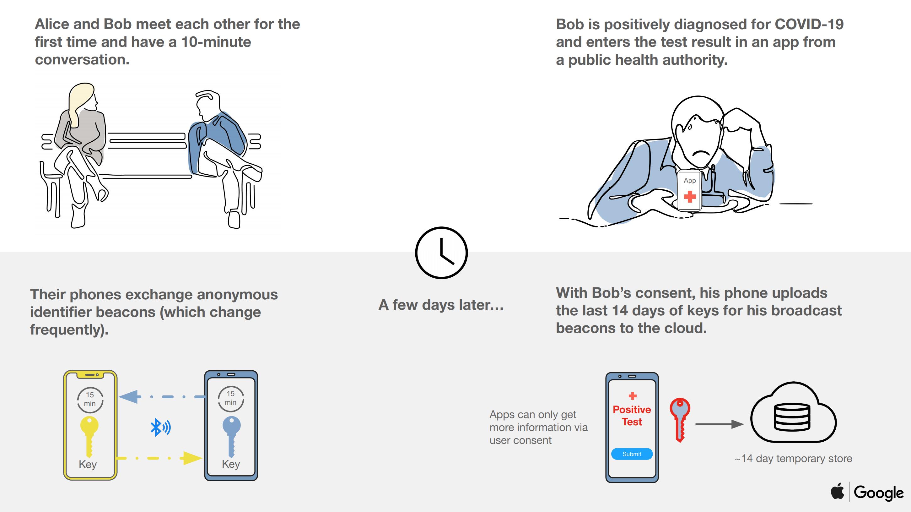 The system works by assigning a random, rotating identifier to a person’s phone and transmitting it via Bluetooth to nearby devices. That identifier, which rotates every 15 minutes and contains no personally identifiable information, will pass through a simple relay server that can be run by health organizations worldwide.