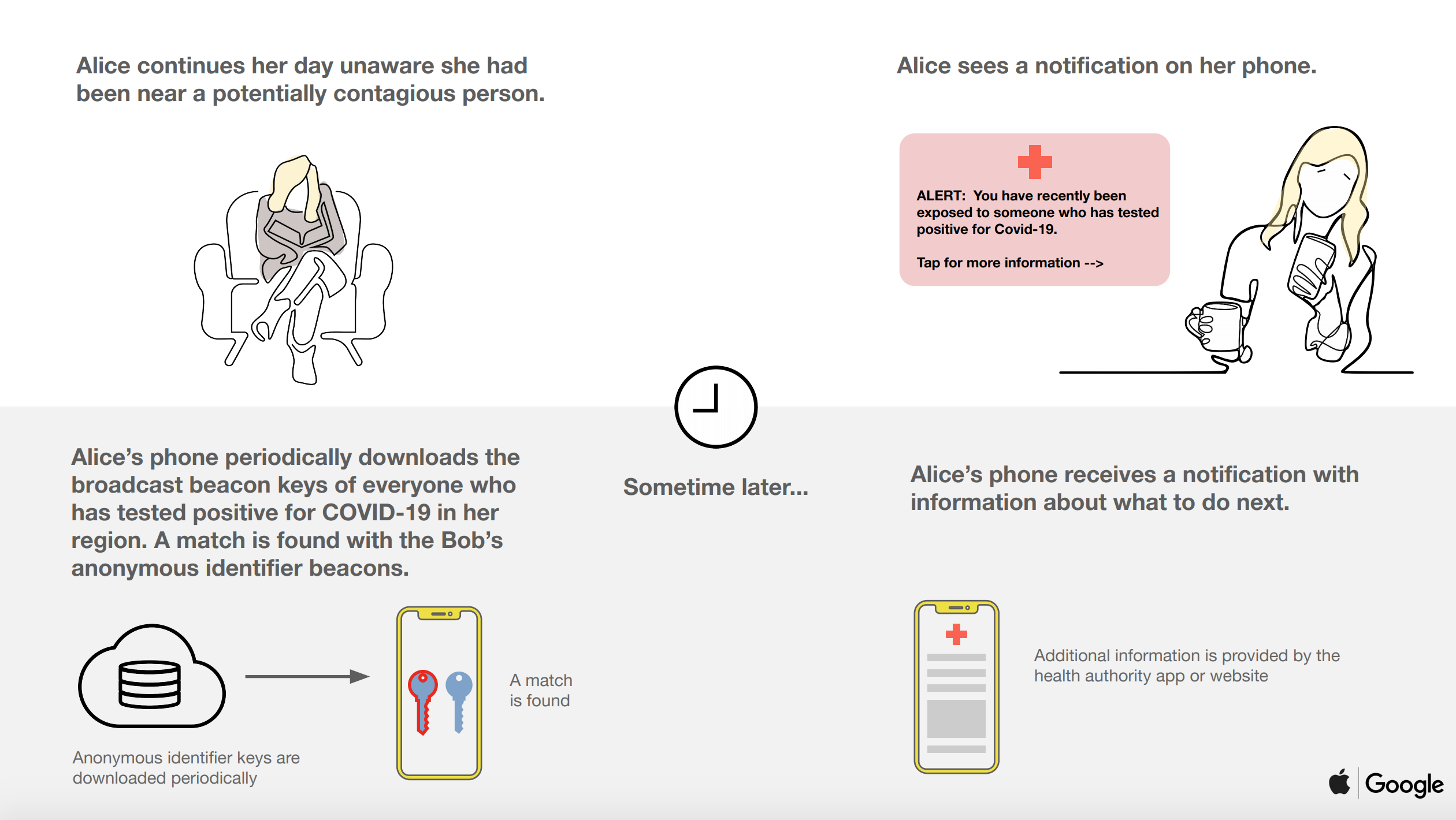 If a match is found with another user that has told the system that they have tested positive, you are notified and can take steps to be tested and to self-quarantine.