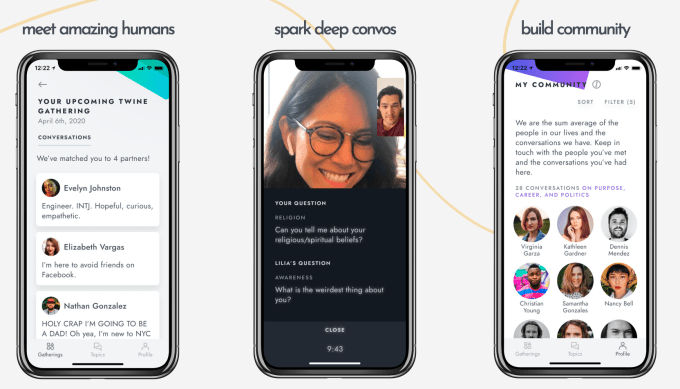 A new startup called twine wants to help people feel less isolated and alone. Though the project has been in the works for around six months, it’s launching at a time when people are struggling with being cut off from family, friends, neighbors, co-workers and others due to the COVID-19 outbreak and the resulting government lockdowns. Described simply as a “Zoom for meeting new people,” twine is a group video chat experience where people are encouraged to have meaningful discussions that spark new friendships. Twine users are matched with four other partners who they’ll then have 1-to-1 conversations with for eight minutes apiece. The full gathering lasts for a total of 40 minutes. The app is in private beta testing now on iOS.