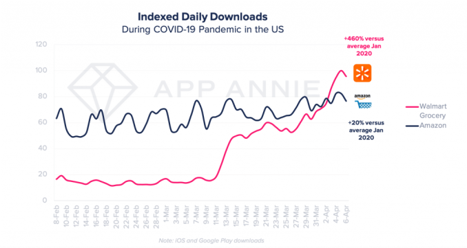 Record demand for online grocery shopping amid the COVID-19 pandemic has sent the apps for grocery pickup and delivery services up the charts. Walmart Grocery, as a result, hit an all-time high in downloads — grabbing the No. 1 position across all Shopping apps in the U.S. on April 5, 2020, and surpassing Amazon by 20%, according to an analysis from app intelligence firm App Annie, citing data from the App Store and Google Play combined.