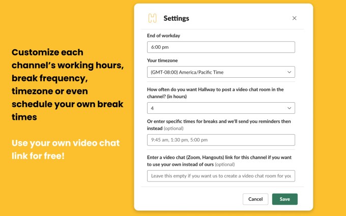 By default, Hallway’s break rooms are scheduled every two hours between 9 AM and 6 PM Monday through Friday, but users can adjust the timezone and adjust the frequency of the breaks by typing in /hallway in a Slack channel to customize the settings.
