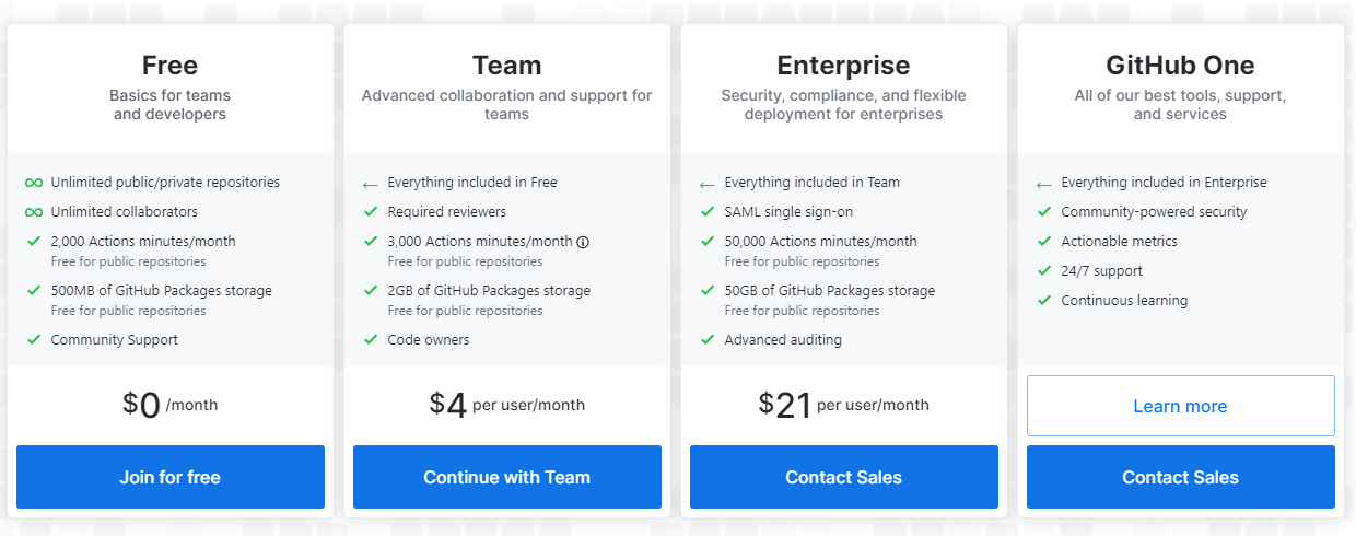 Teams that want more advanced features like code owners or enterprise features like SAML support will still have to upgrade to a paid plan, but those now start at $4 per month and user for the Teams plans instead of the previous $9, with the Enterprise plan starting at $21 per month and user.