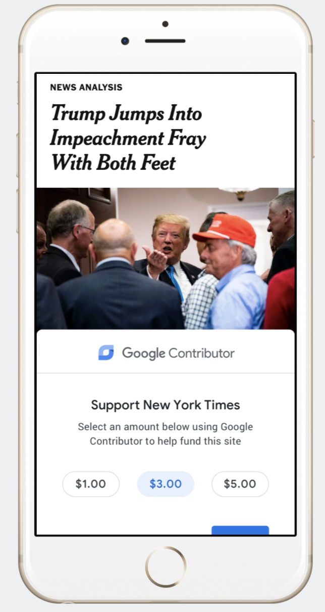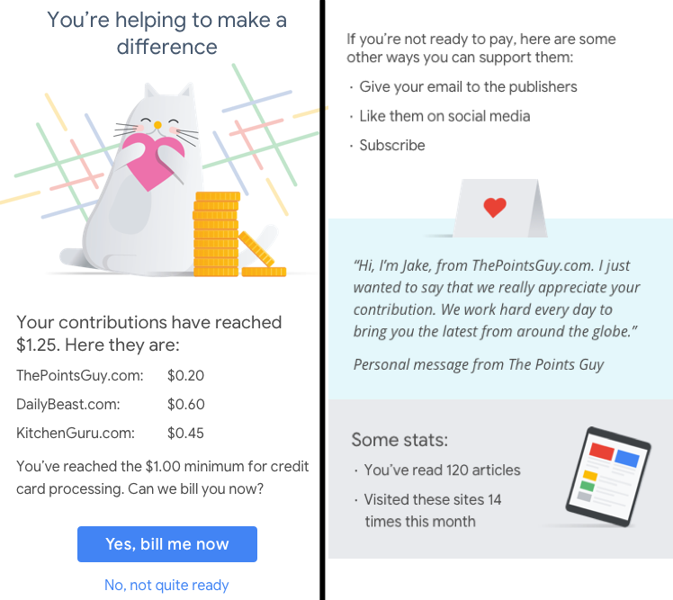Google got into the publisher funding space with Google One Pass in 2011, helping users buy subscriptions to sites before it was shut down a year later. In 2014, Google Contributor launched to let people pay a monthly fee in exchange for ad removal on partnered sites, but that program concluded around the end of 2016.