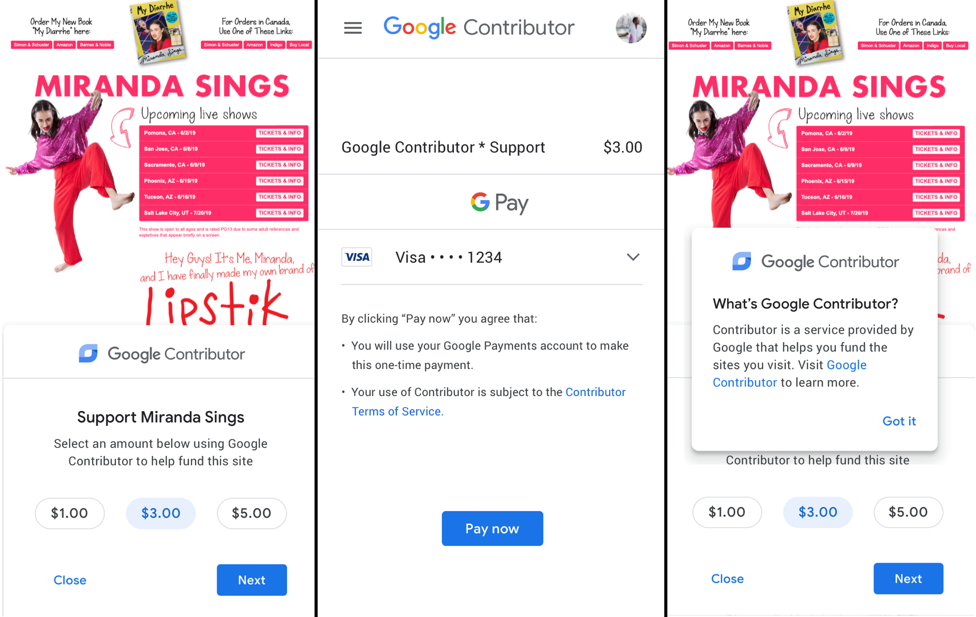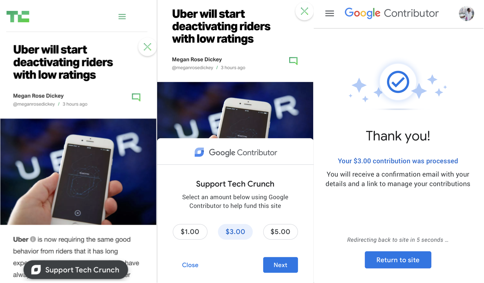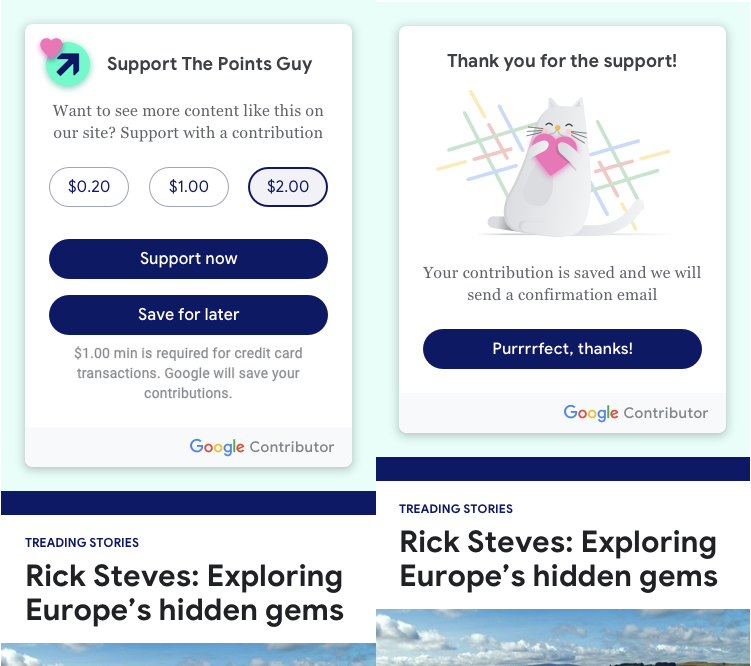 After choosing one, users log into their Google account if they aren’t already, and then “By clicking ‘Pay now’ you agree that: You will use your Google Payments account to make this one-time payment.” You’re then returned to the page you were viewing, with the button saying “Thank you for your support!” before shrinking to just the Contributor logo.