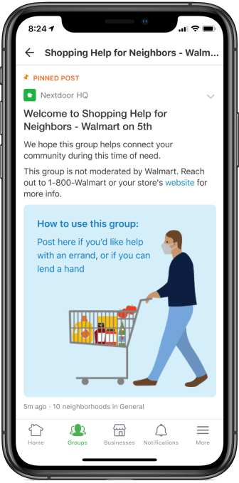 Nextdoor will also make the Walmart groups easy to find by pinning them to the top of the Groups tab, it says.