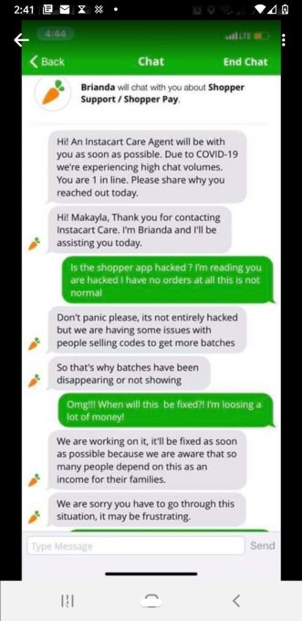 She and others have reached out to Instacart to report the issue, Carmichael said. But in her experience and the experience of those she knows, Instacart has not responded. Some shoppers, however, are able to get through to Instacart support about this issue. As you can see below, Instacart acknowledges an issue and told one shopper it will “be fixed as soon as possible.”