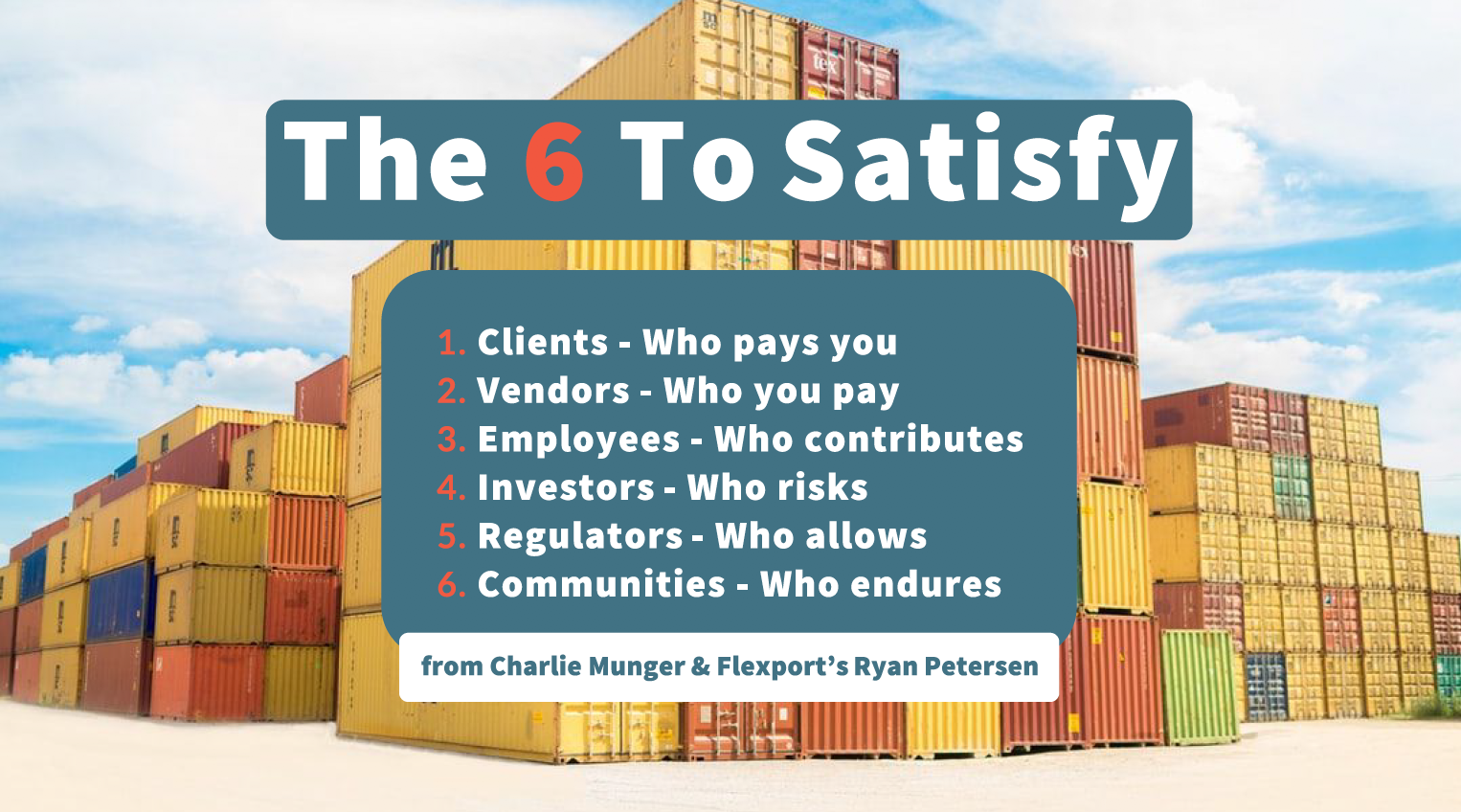 The first framework is from Petersen’s mentor and American business mogul Charlie Munger. It lays out the six stake-holders or ‘customers’ a business must satisfy to succeed. Here’s how Petersen describes them: