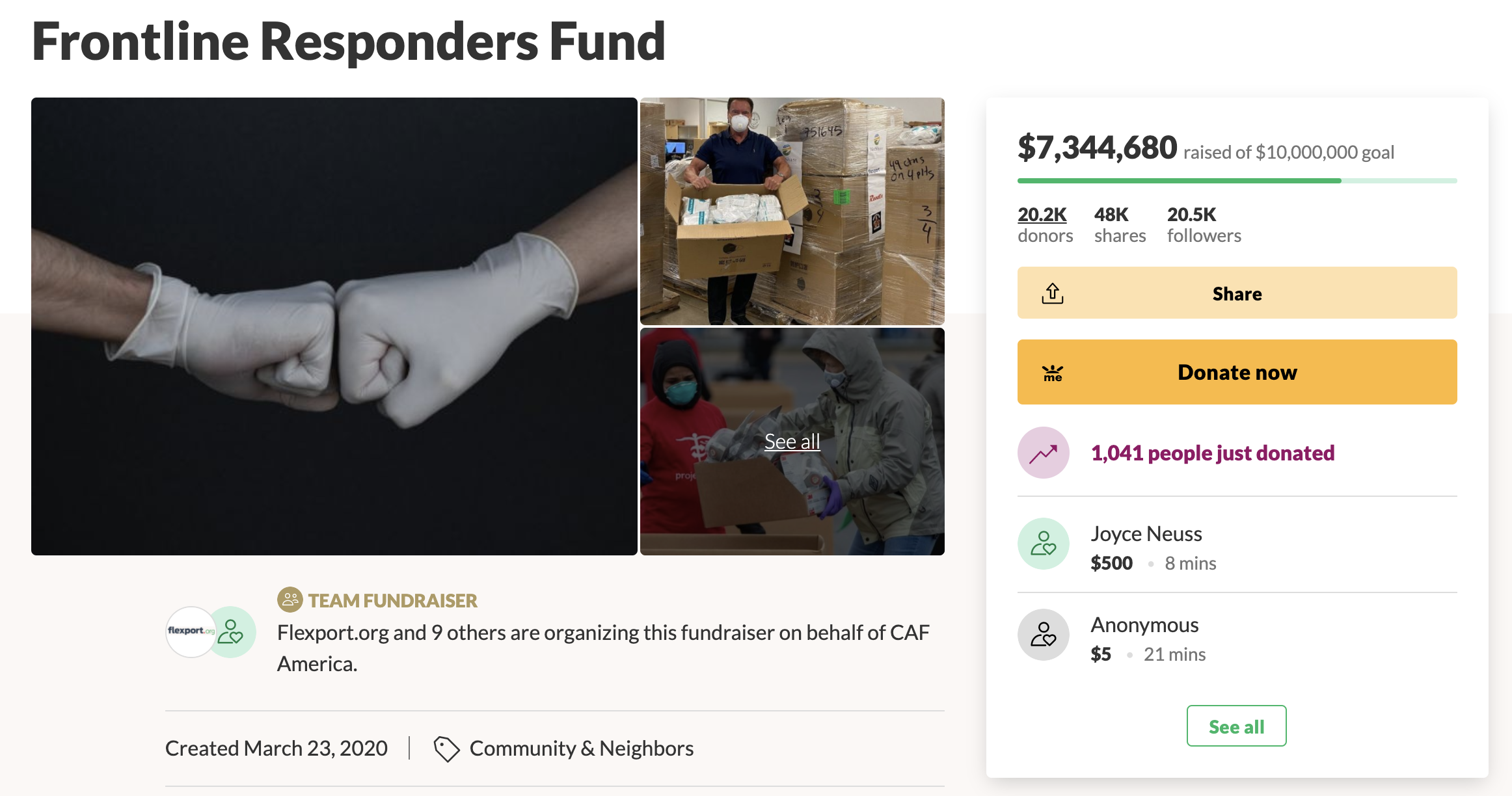 “100% of your donation to this cause will go directly toward shipping masks to people on the front lines as fast as possible. I give you my word that we won’t waste a penny of your money” Petersen tweeted. Despite his business encountering its own troubles with global trade and demand disrupted, he shifted to spending his full time running Flexport.org and promoting the FRF. With the help of celebs like Arnold Schwarzenegger and Edward Norton, it’s raised over $7 million. The FRF has delivered over 6.9 million masks, 240,000 gowns, 1,000 ventilators, 155,000 gloves, and 250,000 meals for vulnerable populations.